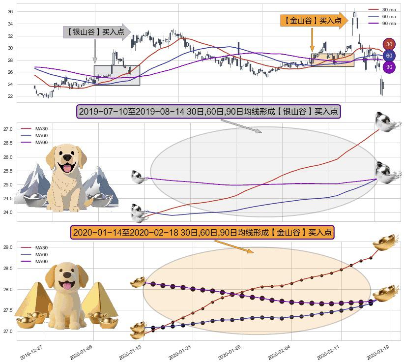 ⚃ 2020-01-15-日至2020-02-18-日显现 30日-60日-90日均线 【金山谷】买入点 其再次确认了买入信号,可靠性更强,买入