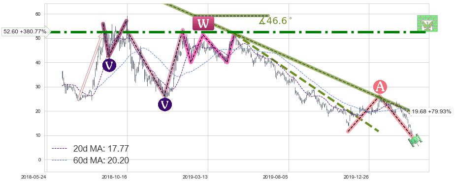 从2018-10-15至2020-03-13,共包含355个交易日,阶段股价下跌-127.01%,阶段股价变动位移路程比: 1 : 9,下跌趋势角度: 46.6