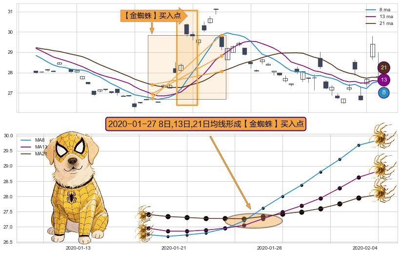形态多维评估: ⚀ 2020-01-27日显现 8日-13日-21日均线 【金蜘蛛】买入点 看多信号,后市看涨,买入