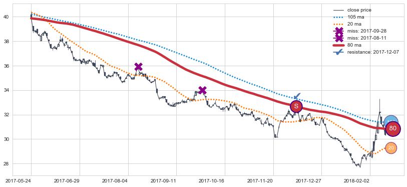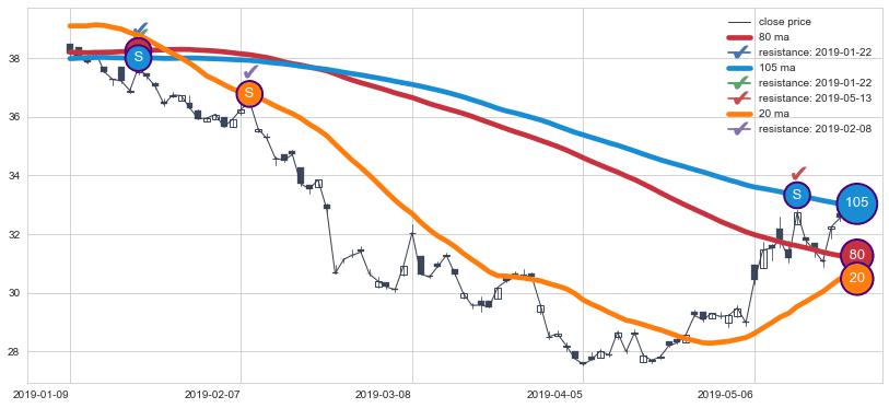 下跌趋势2019-01-09-2019-05-20,均线80, 105, 20确认关键阻力3处