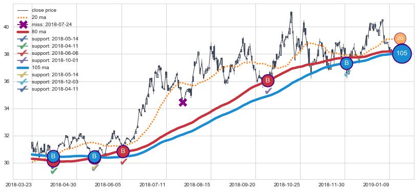 上涨趋势2018-03-23-2019-01-14,均线80, 105确认关键支撑5处