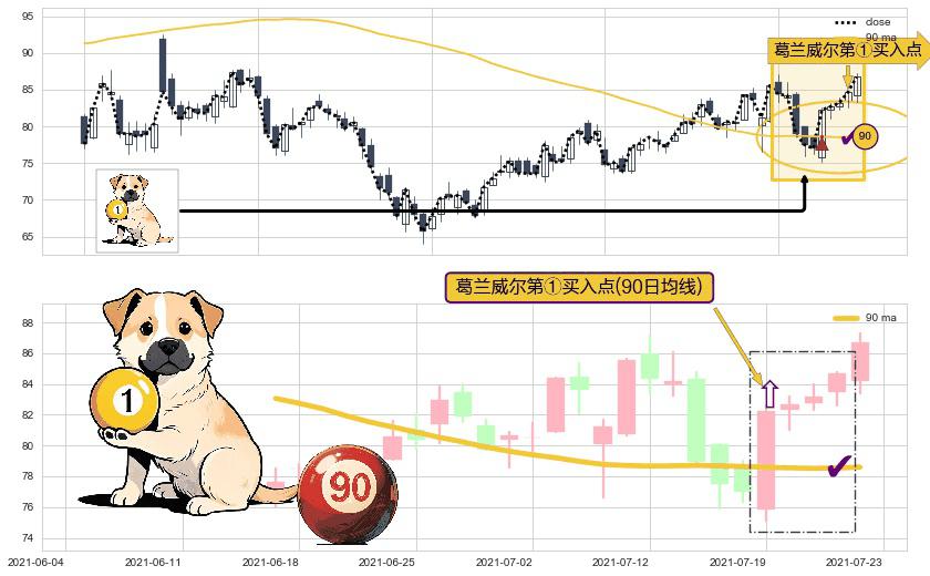 形态多维评估: ⚀ 2021-07-19-日显现 葛兰威尔均线 90日均线 第买①入点 走势反转见底信号,后市看涨,买进信号
