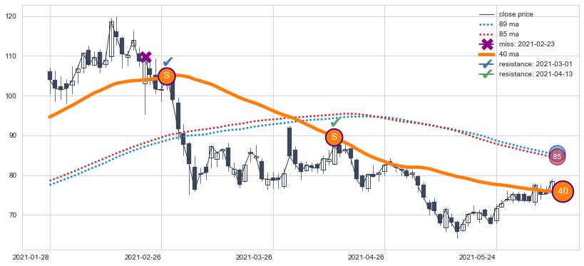 下跌趋势2021-01-28-2021-06-07,均线40确认关键阻力2处