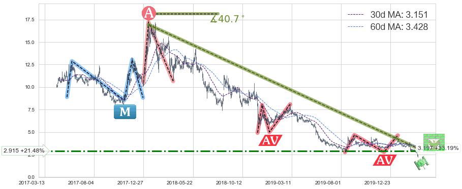 🦴 长线均值回复组合短线趋势跟踪[强阻力信号]2018-01-11-2020-03-13下跌趋势依然成立(下跌趋势跟踪依然存在),短线价格略微上行反弹(均值回复猜想),即将接近下跌趋势提供的未破位阻力价格:3.197。