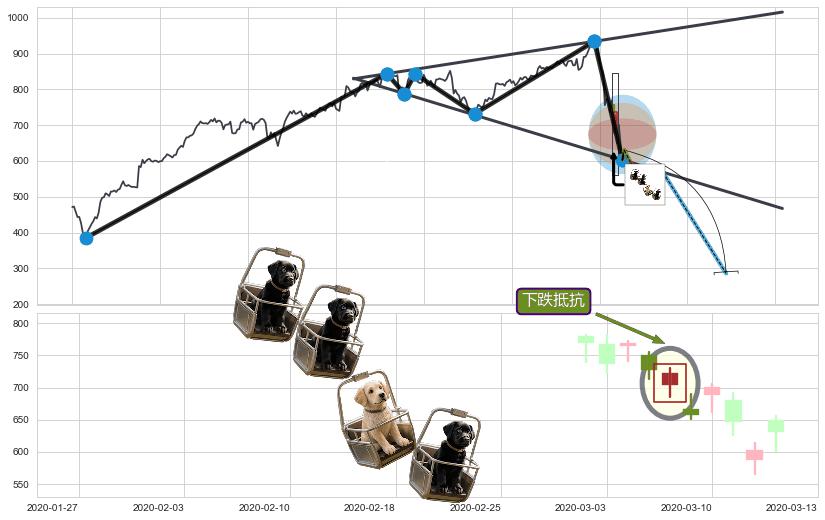 ➢ 收盘价(2020-03-13: 630.36 )→回踩→第一根k线低点(2020-03-11: 626.19 )