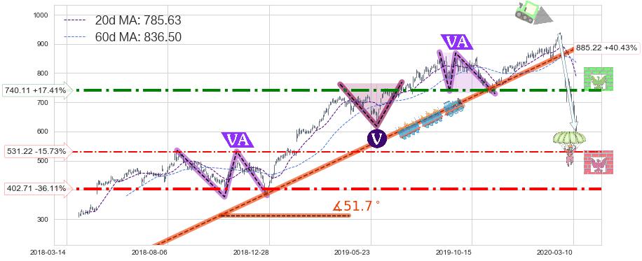 ➣ 2018-04-02-2020-03-11上升趋势存在反转[风险],其原上升趋势的支撑位(885.22)已破位[强阻力信号],原上升趋势角度: 51.7˚