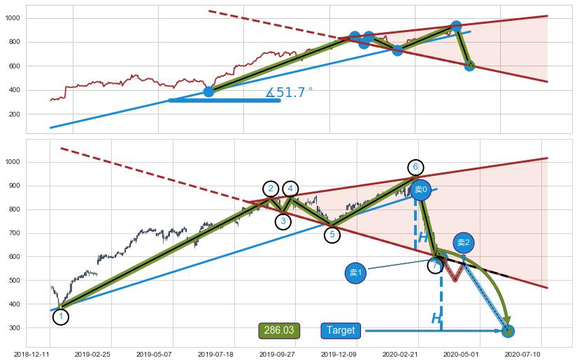➢ 最小反转跌幅→𝐇: 306.99 (逐步抬高阻力斜边最后的阻力点⑥与支撑边垂直距离)