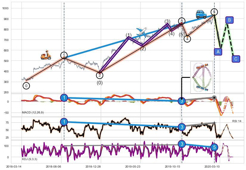 ➢ 1,3,5驱动浪MACD, RSI, KDJ走势都出现【常规背离】反转信号增强