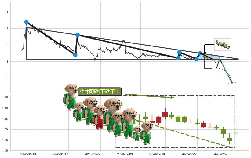 | 4 🅚:下跌抵抗 ➕ 📐:下降三角整理下行突破支撑位破位, 猜想持续下沉下跌,被突破的支撑位已变为阻力位 ☞ 看空信号 ⇥ 【🅚线】交织【图形】⇥ 综合量化分数: 46 | > |