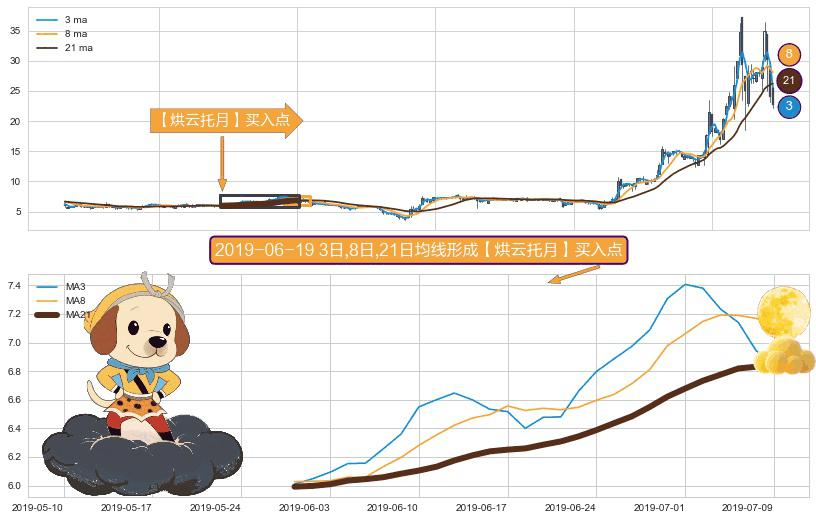 ⚀ 2019-05-30日-2019-07-09日显现 3日-8日-21日均线 【烘云托月】买入点 看多信号,后市看涨,买入