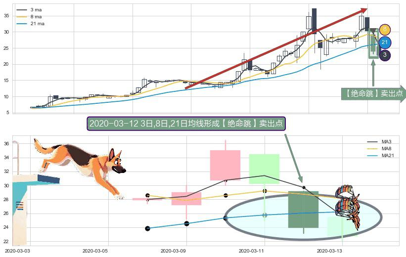 ⚀ 2020-03-12日显现 3日-8日-21日均线 【绝命跳】卖出点 看空信号,后市看跌,卖出