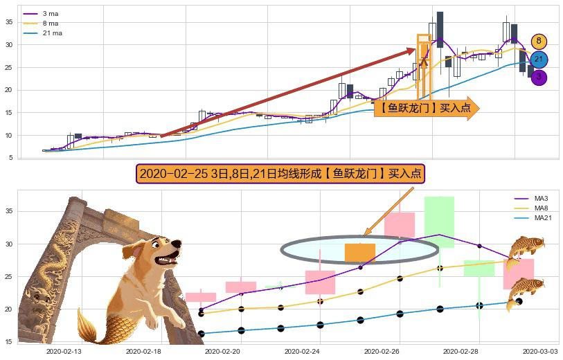⚀ 2020-02-25日显现 3日-8日-21日均线 【鱼跃龙门】买入点 看多信号,后市看涨,买入