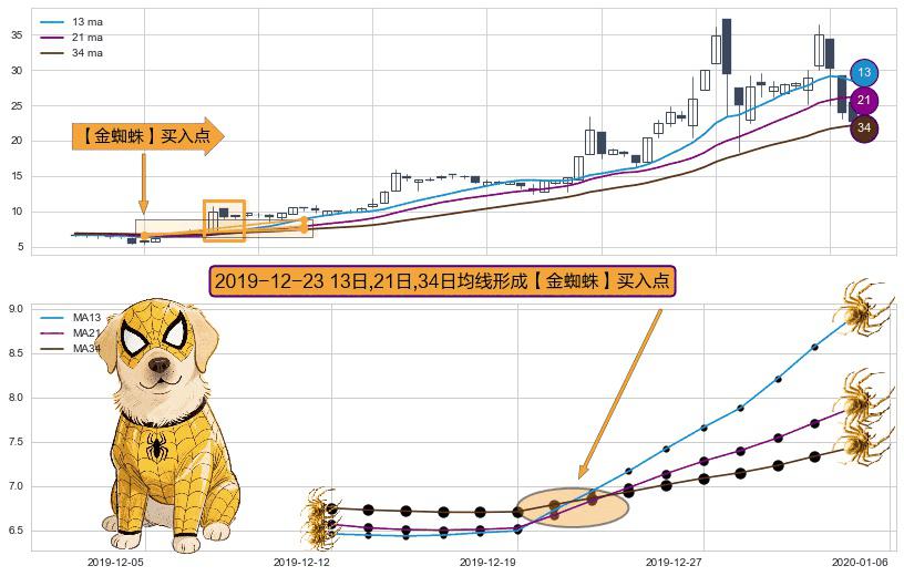 ⚀ 2019-12-23日显现 13日-21日-34日均线 【金蜘蛛】买入点 看多信号,后市看涨,买入