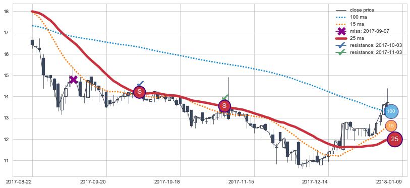 2017-08-22至2018-01-09 慢线与快线呈空头排列, 慢线与快线接触少,无缠绕