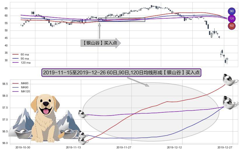 形态多维评估: ⚀ 2019-11-18-日至2019-12-26-日显现 60日-90日-120日均线 【银山谷】买入点 看多信号,后市看涨,买入