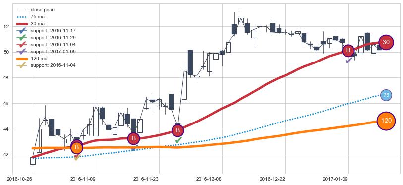 上涨趋势2016-10-26-2017-01-17,均线120, 30确认关键支撑4处