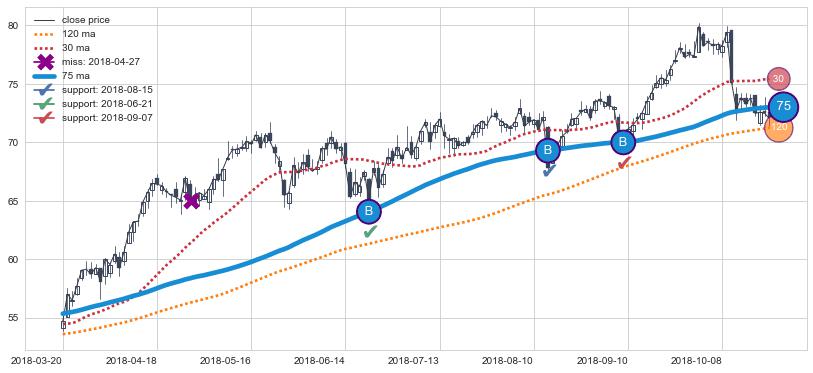 上涨趋势2018-03-20-2018-10-22,均线75确认关键支撑3处