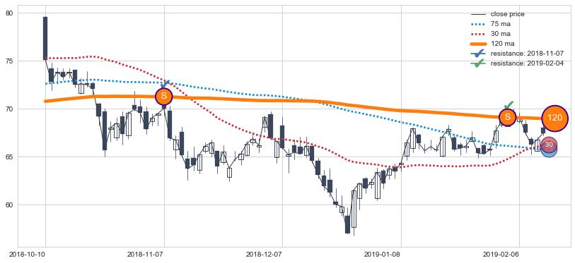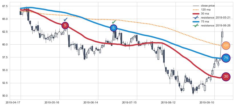 下跌趋势2019-04-17-2019-09-16,均线75, 30确认关键阻力2处