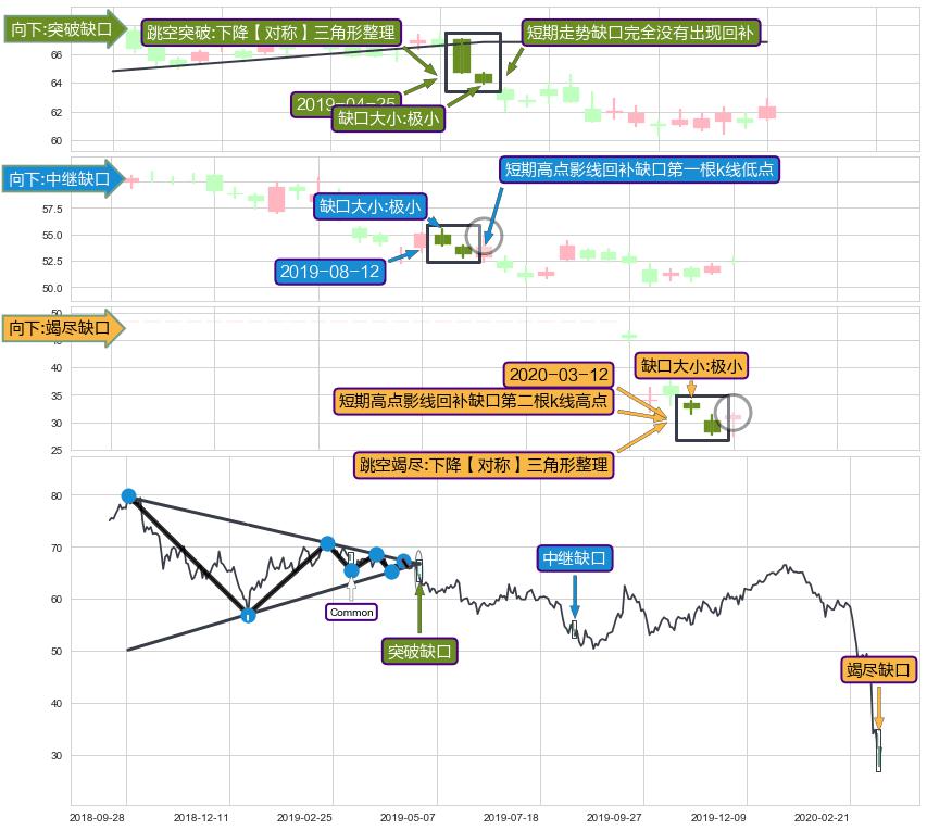 ➣ 普通缺口在【下降【对称】三角形整理】震荡整理形态中出现