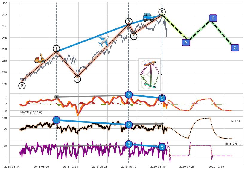 ➢ 1,3,5驱动浪MACD, RSI, KDJ走势都出现【常规背离】反转信号增强