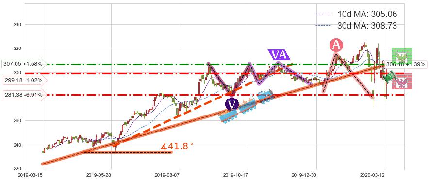 ♘ 阻力价格位307.05,可信任强度65.25%,距离最后交易2020-03-13形成的收盘价格302.27相差 +1.58%