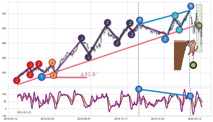 ✂️ 2019-03-15-2020-03-11上升趋势存在反转[风险],虽然原上升趋势的支撑位(306.48)已破位,但其支撑效果尚存,原上升趋势角度: 41.8˚