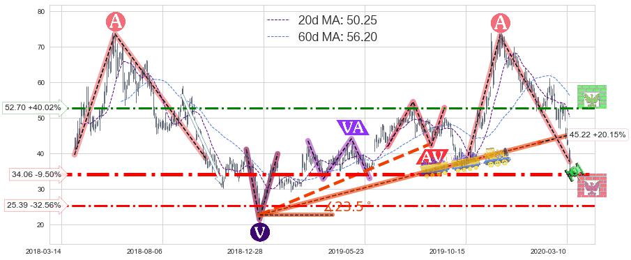 ♘ 阻力价格位52.70,可信任强度56.64%,距离最后交易2020-03-13形成的收盘价格37.64相差 +40.02%