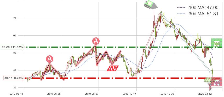 ♘ 阻力价格位53.25,可信任强度80.44%,距离最后交易2020-03-13形成的收盘价格37.64相差 +41.47%