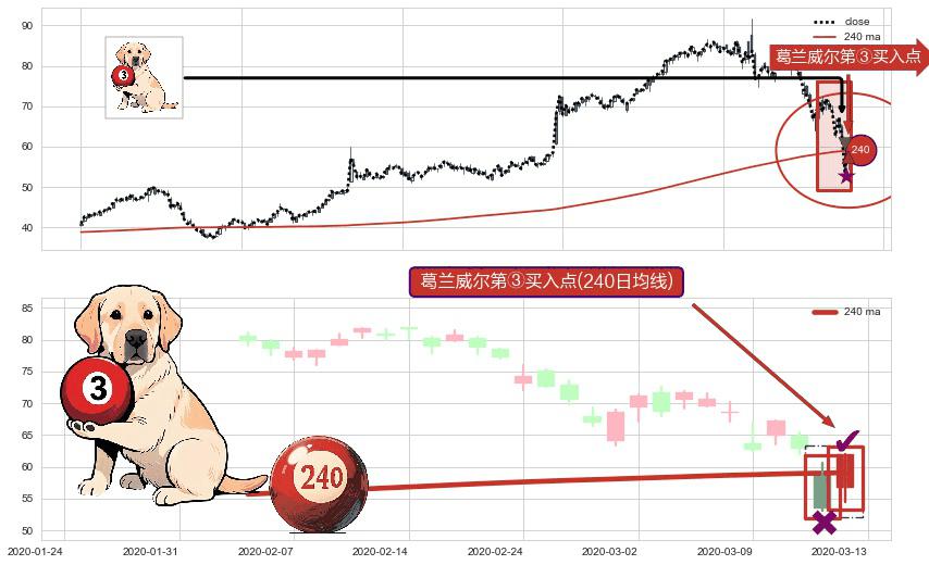 形态多维评估: ⚀ 2020-03-13-日显现 葛兰威尔均线 240日均线 第③买入点 上升趋势的中继信号,后市看涨,买进信号