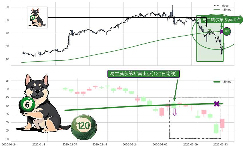 形态多维评估: ⚀ 2020-03-03-日显现 葛兰威尔均线 120日均线 第⑥卖出点 走势反转见顶信号,后市看跌,卖出信号