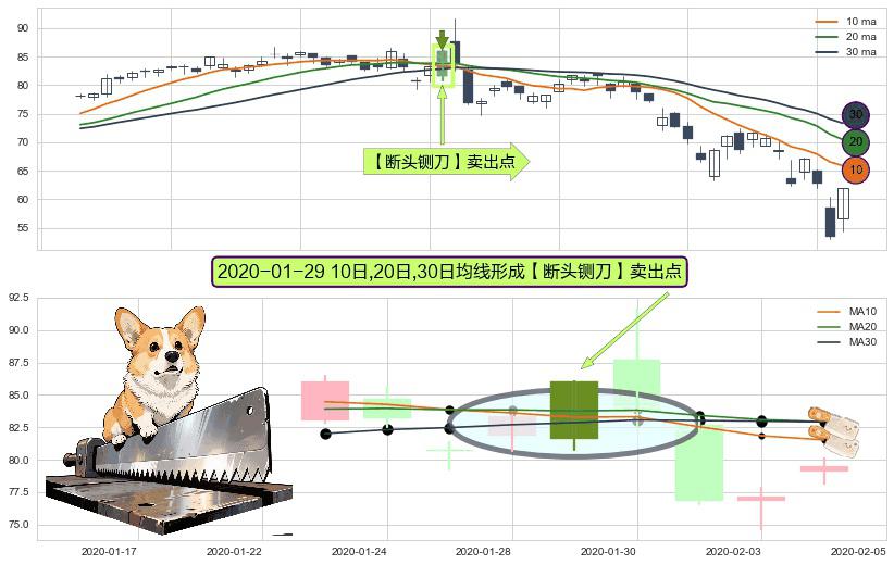 形态多维评估: ⚀ 2020-01-29日显现 10日-20日-30日均线 【断头铡刀】卖出点 看空信号,后市看跌,卖出