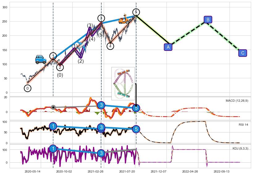 ➣ 1,3,5驱动浪MACD, RSI, KDJ走势都出现【常规背离】反转信号增强
