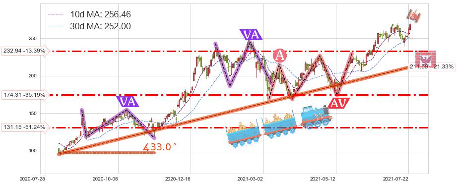 ♘ 在最后的上升阶段2020-08-10至2021-07-23存在 持续未破位的支撑位 ,支撑价格211.59,支撑可信任强度88.06%,其距离最后价格268.96相差 -21.33%
