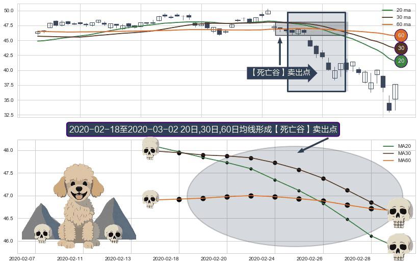 ⚂ 【死亡谷】卖出点 由MA20均线下穿MA30均线和MA60均线,MA30均线下穿MA60均线形成