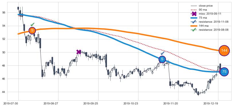 下跌趋势2019-07-30-2019-12-20,均线144, 75确认关键阻力2处