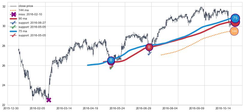 上涨趋势2015-12-30-2016-10-14,均线90, 75确认关键支撑2处