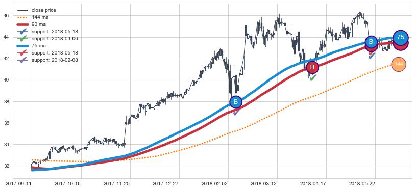 上涨趋势2017-09-11-2018-06-05,均线90, 75确认关键支撑3处