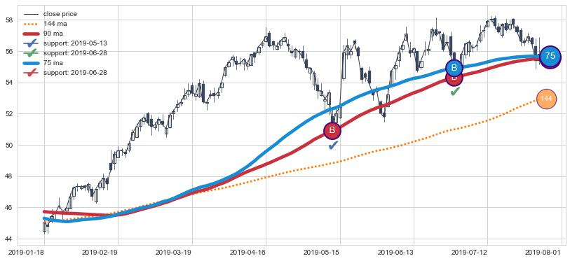 上涨趋势2019-01-18-2019-08-01,均线90, 75确认关键支撑2处