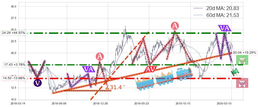 ✂️ 2018-06-19-2020-03-06上升趋势存在反转[风险],其原上升趋势的支撑位(20.04)已破位[强阻力信号],原上升趋势角度: 31.4˚