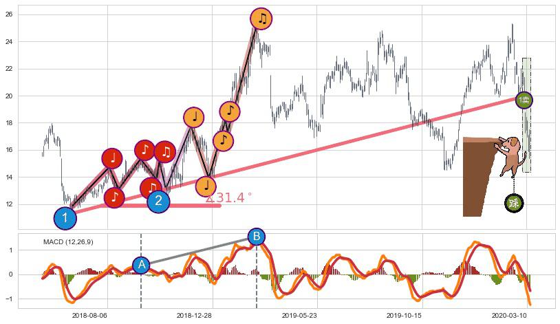 从2018-06-19至2020-03-06,共包含432个交易日,阶段股价上涨73.07%,阶段股价变动位移路程比: 1 : 12,上涨趋势角度: 31.4