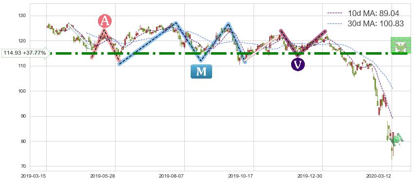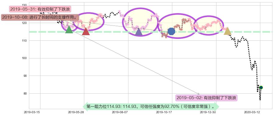 ♘ 阻力价格位114.93,可信任强度92.70%,距离最后交易2020-03-13形成的收盘价格83.42相差 +37.77%