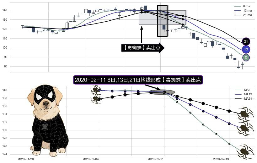 ⚀ 2020-02-11日显现 8日-13日-21日均线 【毒蜘蛛】卖出点 看空信号,后市看跌,卖出