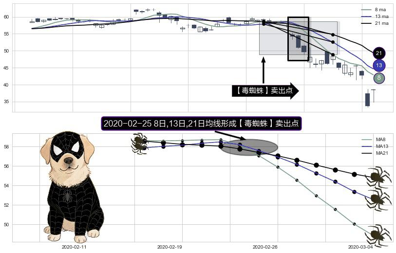 ⚀ 2020-02-25日显现 8日-13日-21日均线 【毒蜘蛛】卖出点 看空信号,后市看跌,卖出