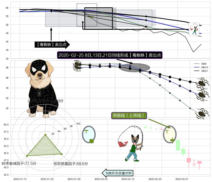 | 2 🅚:下跌螺旋桨 ➕ 🎢:【毒蜘蛛】卖出点均线组合卖出点信号形成后,猜想三条均线周期内的交易者都看空后市,持续下跌 ☞ 看空信号 ⇥ 【均线】交织【🅚线】⇥ 综合量化分数: 46 | > |