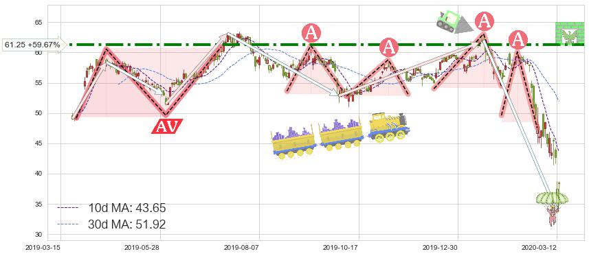 ♘ 阻力价格位61.25,可信任强度73.97%,距离最后交易2020-03-13形成的收盘价格38.36相差 +59.67%