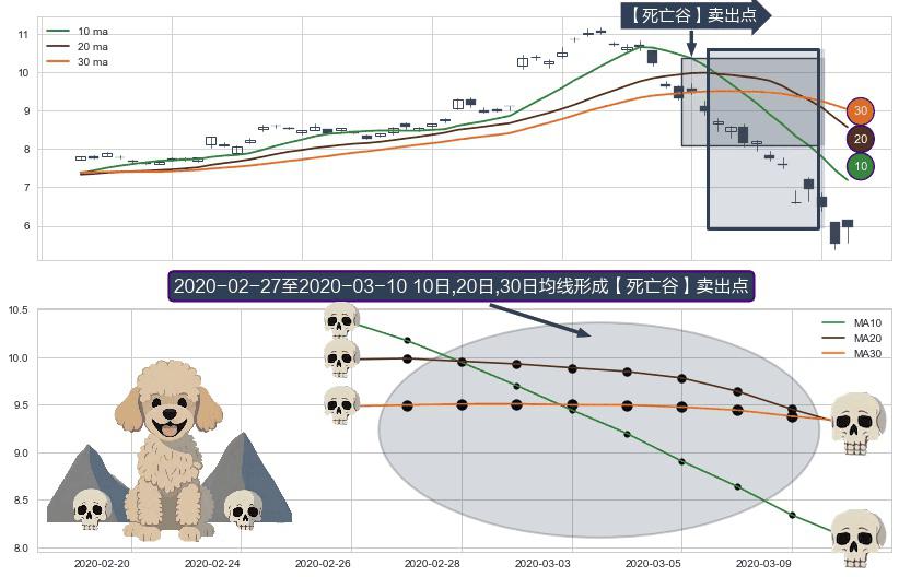 ⚂ 【死亡谷】卖出点 由MA10均线下穿MA20均线和MA30均线,MA20均线下穿MA30均线形成