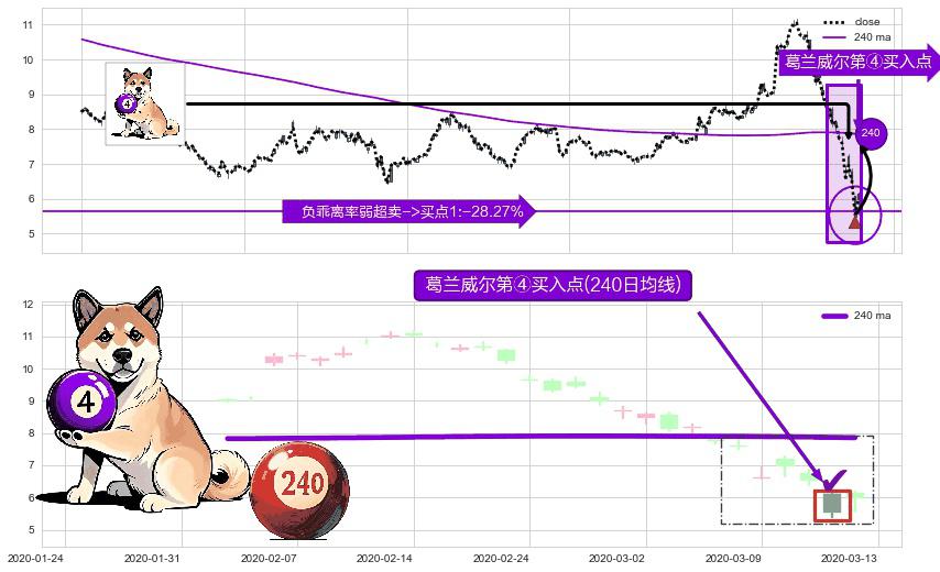 形态多维评估: ⚀ 2020-03-12-日显现 葛兰威尔均线 240日均线 第④买入点 下降趋势均值回复的短线反弹信号,后市看涨,买进信号