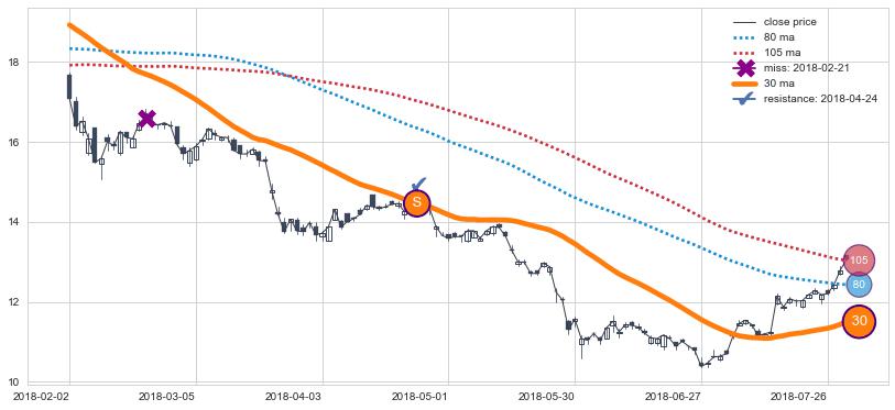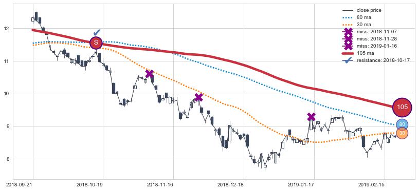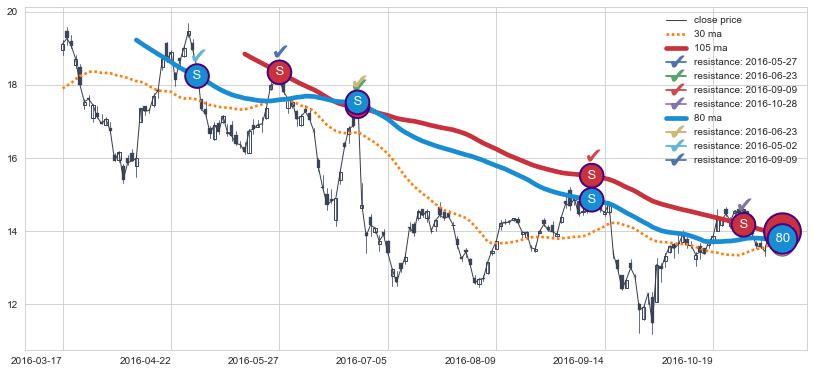 下跌趋势2016-03-17-2016-11-07,均线80, 105确认关键阻力5处