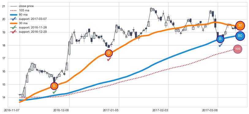 上涨趋势2016-11-07-2017-03-15,均线80, 30确认关键支撑3处