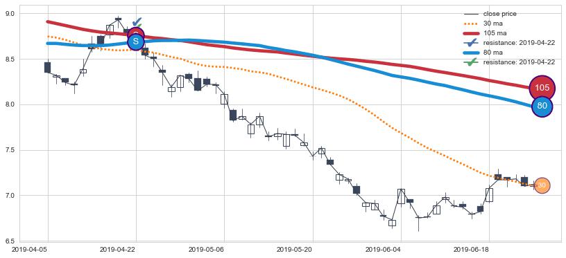 下跌趋势2019-04-05-2019-06-25,均线80, 105确认关键阻力1处